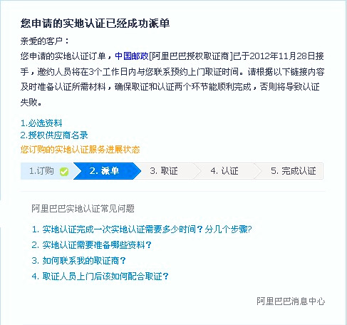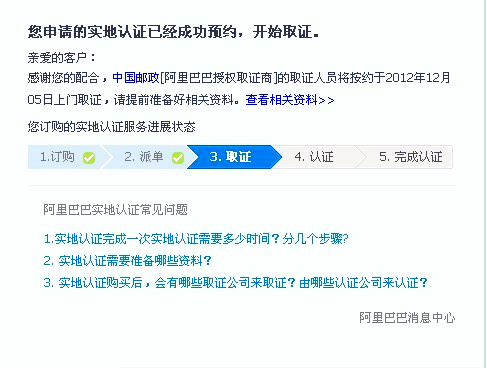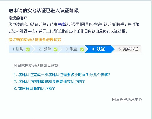 阿里巴巴實地認證服務(wù)分為取證與認證兩個環(huán)節(jié),取證服務(wù)有特定的取證商:中國郵政和中誠信;認證服務(wù)有特定的認證商:中誠信,杭州中德,北京匯華。如果你那的材料齊全,在上門取證后的16個工作日內(nèi)會有認證結(jié)果(認證成功或認證失敗),并且到時會有旺旺浮出提醒。
