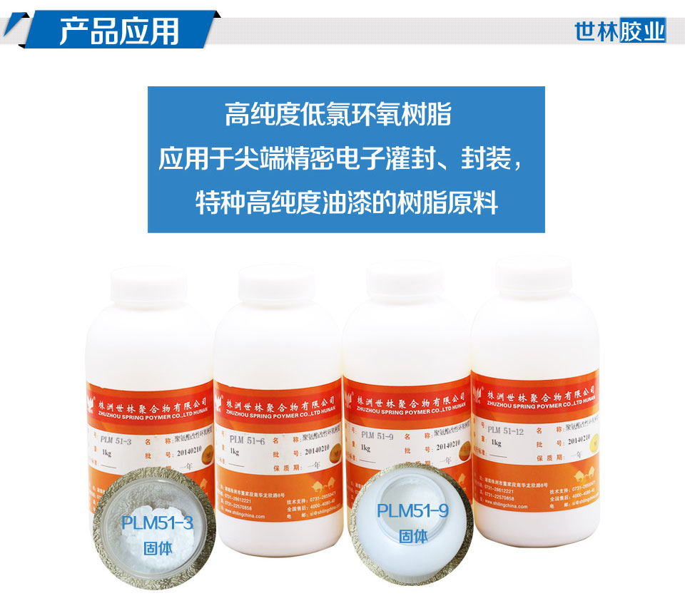高純度低氯環(huán)氧樹脂  PLM51-3  是專業(yè)用于高尖端電子產(chǎn)品封裝和高尖端電子產(chǎn)品灌封的原材料,將這些高純度低氯環(huán)氧樹脂加入到他們原來的配方體系里面,降低灌封膠的總氯含量,改善電子灌封膠的耐腐蝕性能,令電子產(chǎn)品能更好起到封裝效果,能更好的應(yīng)用于大型產(chǎn)品裝配中,起到很好的鏈接作用。
